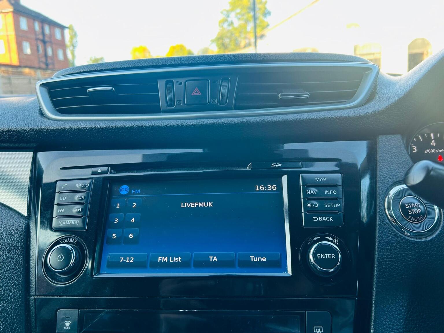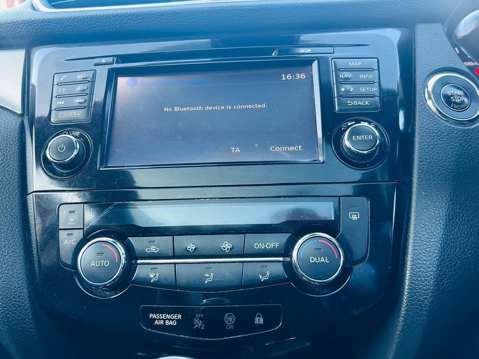 18in Alloy Wheels - Bi-Colour, 3 Height Adjustable Rear Headrests, 6 Speakers, 60-40 Split Rear Folding Seats, AM-FM Radio and CD Player, AUX Socket, Advanced Drive Assist Display - 5in TFT Coloured Screen, Ambient Lighting Centre Console, Anti Dazzle Rear View Mirror, Auto Wipers, Bluetooth, Body Coloured Door Mirrors, Body Coloured Handles, Boot Light, Carbon Graphite Dash Trim, Chrome Glass Surround, Chrome Interior Door Handles, Cruise Control with Speed Limiter, DAB Digital Radio, Daytime Running Lights Dip Function When Turn Signal Applied, Driver Seat Height Adjustment, Driver-Passenger-Side and Curtain Airbags, Drivers Seat with Manual Lumbar Support, Dual Zone Climate Control Air Conditioning, ESP ABS EBD and Brake Assist, Electric Auto-Folding Door Mirrors, Electric Parking Brake, Electric Speed-Sensitive Power Steering, Front 12v Power Sockets x2, Front Centre Console and Armrest, Front Seat Belts with Load Limiter and Pretensioners, Front and Rear Door Pockets with Drink Holders, Front and Rear Electric Windows, Front and Rear Seatbelt Warning, Halogen Headlamps, Headlights - High Beam Assist, Height Adjustable Front Head Restraints, Height Adjustable Front Seatbelts, Hill Start Assist, ISOFIX Child Seat Anchoring Points - Rear x2, Intelligent Around View Monitor, Intelligent Auto Headlight, Intelligent Emergency Braking, Intelligent Key, Interior Ambient Lighting, LED Signature Daytime Running Lights, LED Turn Indicator on Door Mirrors, Lane Departure Warning, Leather D Shaped Steering Wheel, Leather Gear Lever, Leather Knee Pad, Luggage Board System, Matt Silver Roof Rails, Monoform Front Seats with Plastic Backboard, Nissan Anti Theft System Immobiliser, Nissan Chassis Controls, NissanConnect Evo Touchscreen Navigation and Entertainment System, One Touch 4 x Auto Windows with Illuminated Switches, Outside Temperature Sensor, Parcel Shelf - Stow Function Under Luggage Board, Parking Sensor - Front, Passenger Airbag Deactivation System, Passengers Seat with Manual Lumbar Support, Pollen Filter, Privacy Glass, Puncture Repair Kit, Rear Parking Sensors, Rear Roof Spoiler, Rear View Camera, Rear Wiper with Reverse Link, Remote Central Locking, Seats - Passengers Height Adjustment, Selectable Steering - Normal or Sport, Shark Fin Antenna, Smart Vision Pack, Smartphone App Integration, Start Push Button, Steering Wheel Mounted Audio Controls, Synthetic Leather Wrapped Door Handle with Contrasting Stitching, TPMS - Tyre Pressure Monitoring System, Tech Pack, Thatcham Category 1 Alarm, Tilt and Telescopic Adjustable Steering Wheel, Traffic Sign Recognition, Trip Computer, USB Port, Underbody Vortex Generators